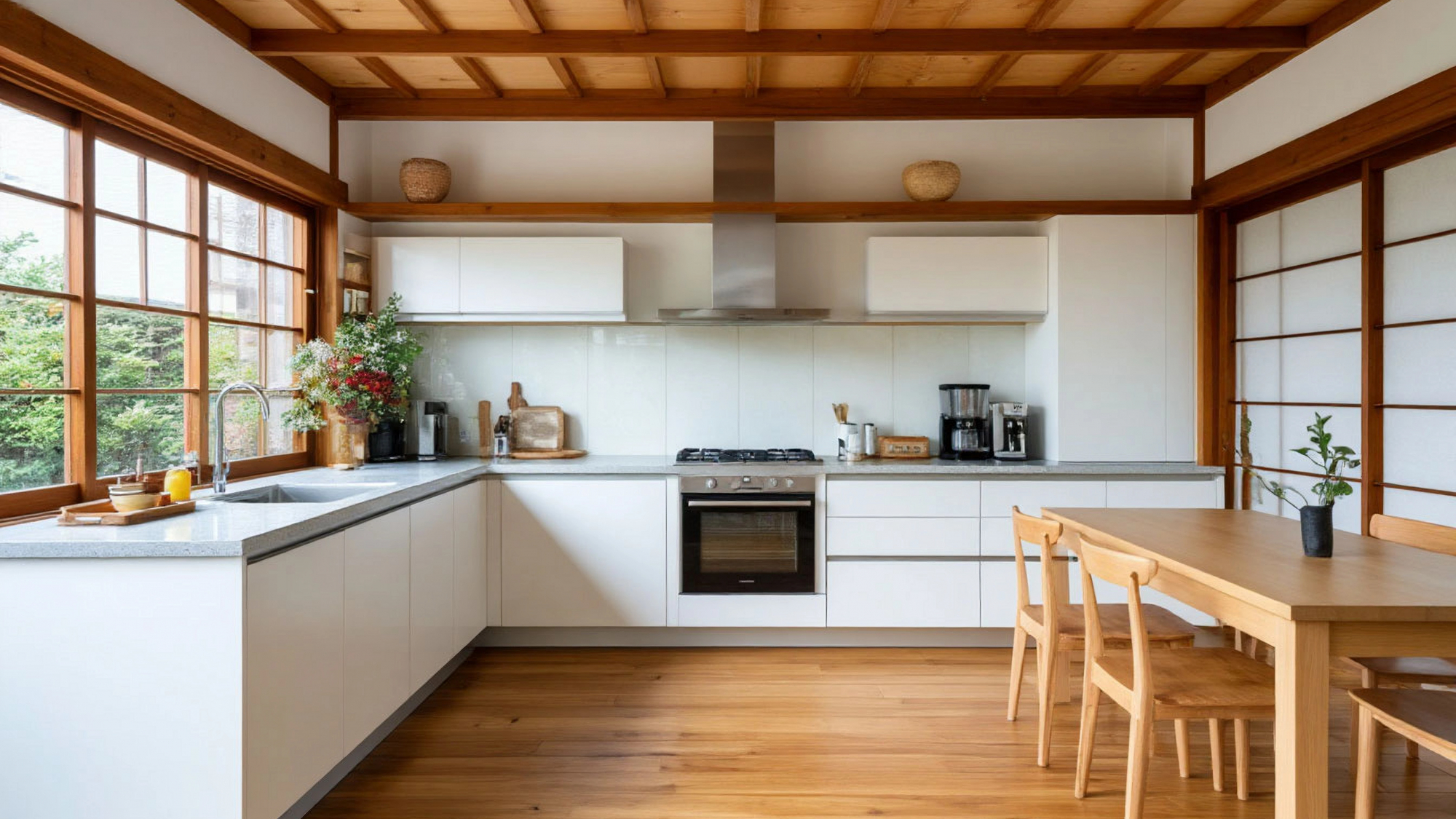 Даже освещение здесь особенное. Оно не давит, не ослепляет, а лишь подчеркивает структуру поверхностей. Свет отражается от фасадов и наполняет комнату теплом, словно солнечный луч, прошедший через бумагу. Это свет, который не утомляет, а утешает. С ним кухня становится живой, как сад под утренним дождём.