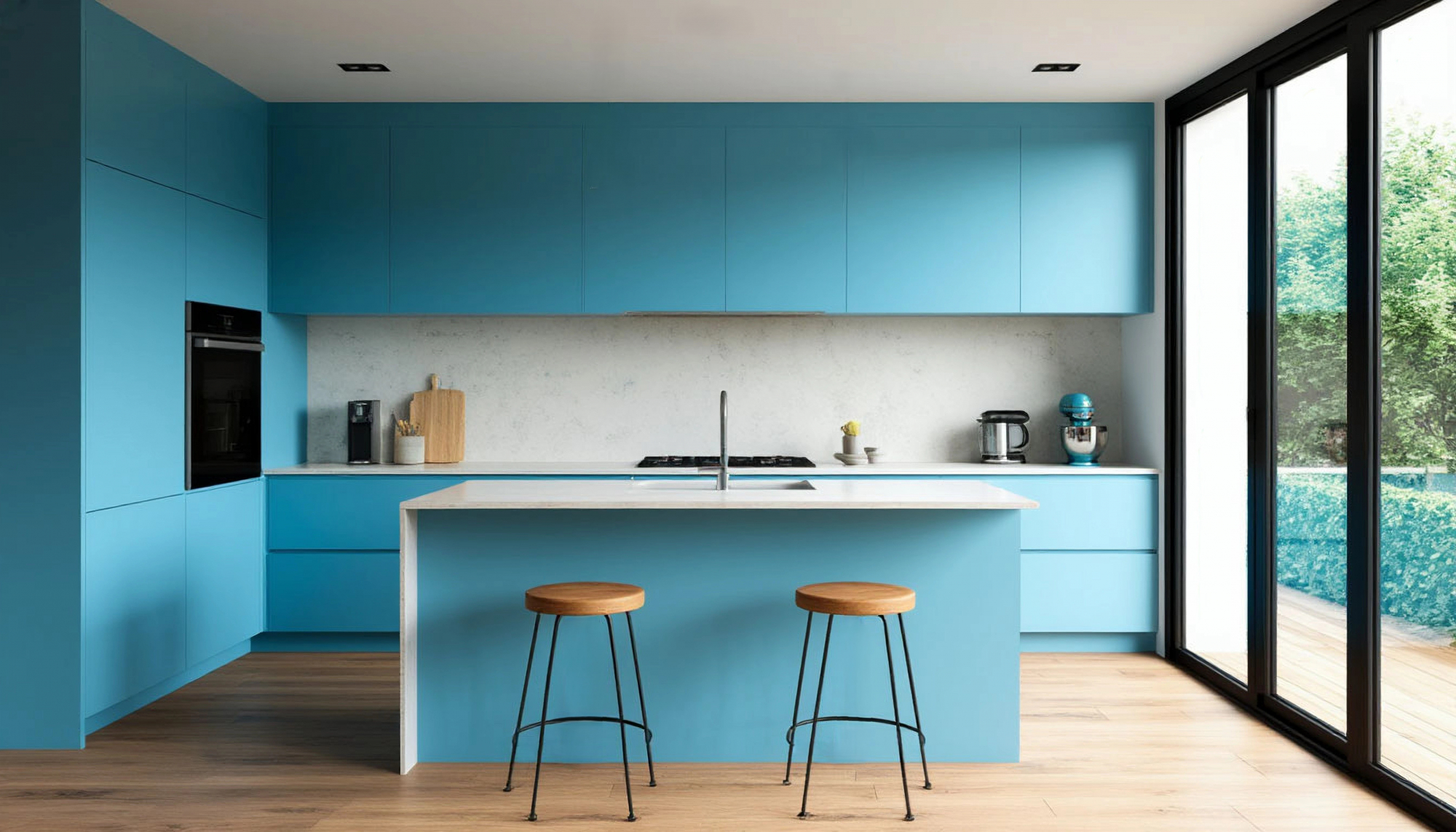 Белые и серые аксессуары, деревянная столешница или мраморная отделка — всё это прекрасно сочетается с голубым цветом фасадов. Такая кухня может стать как центральным акцентом всего интерьера, так и его гармоничным продолжением. Её дизайн позволяет экспериментировать с освещением и фактурами. Например, при тёплом освещении голубой цвет становится мягче, уютнее; при холодном — подчёркивает современный характер и архитектурную точность.