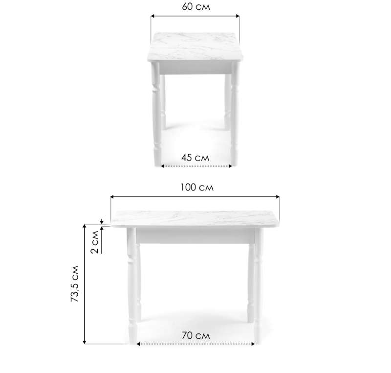 Толщина столешницы: 2 см. Расстояние между ножками:  70 х 40 см.