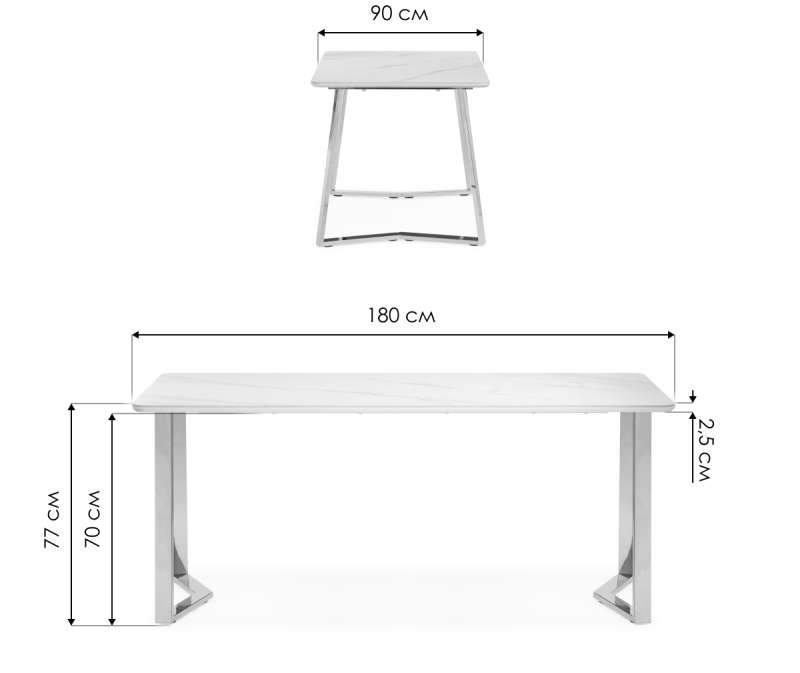 Расстояние между ножками: 116 х 70 см. Толщина столешницы: 2,5 см.
