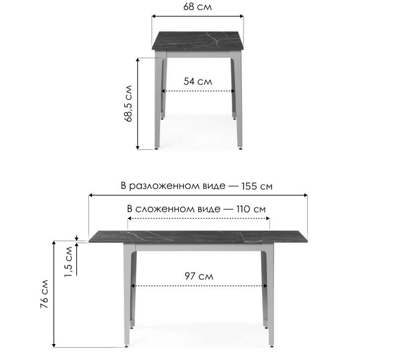 Толщина столешницы: 15 мм. Расстояние между ножками: 97 х 54 см