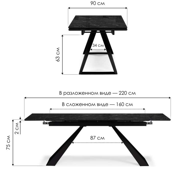 Расстояние между ножками: 87 х 34 см. Толщина столешницы: 2 см.